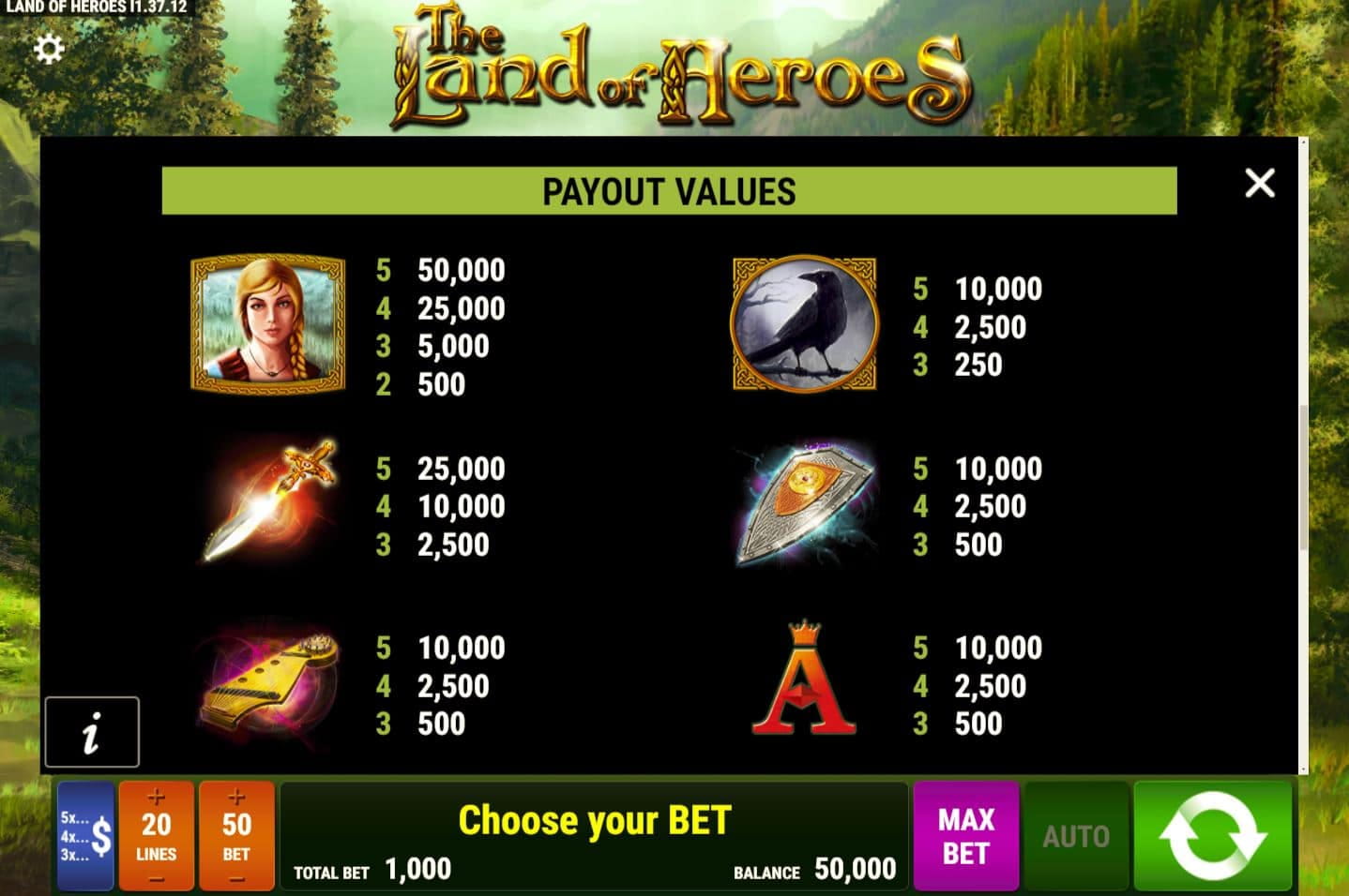 Der The Land of Heroes Slot von Gamomat verfügt über fünf Walzen und wird mit bis zu 20 Gewinnlinien gespielt. Neben den herkömmlichen Spielkartensymbolen sorgen hier verschiedene mystisch anmutende Symbole und ein gottgleich wirkender alter Mann für Gewinne.